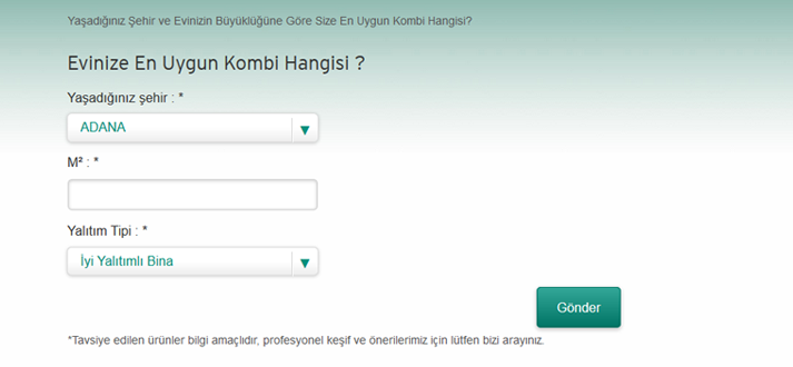 Bulunduğunuz yere uygun kombiyi seçmekte zorlanıyor musunuz ? Ya da yanlış kombi kararının size daha fazlaya mal olacağını biliyor musunuz ? Kombi seçiminde sonradan pişman olmamak için Kombi Seçim Programına katılın ve size en uygun kombiyi bulun. Metrekare ve bina yalıtım özellikleri gibi kriterleri bir araya toplayak performans olarak size en uygun kombiyi seçmenize yardım ediyoruz. Kombi seçim programına katılmak için tıklayın.